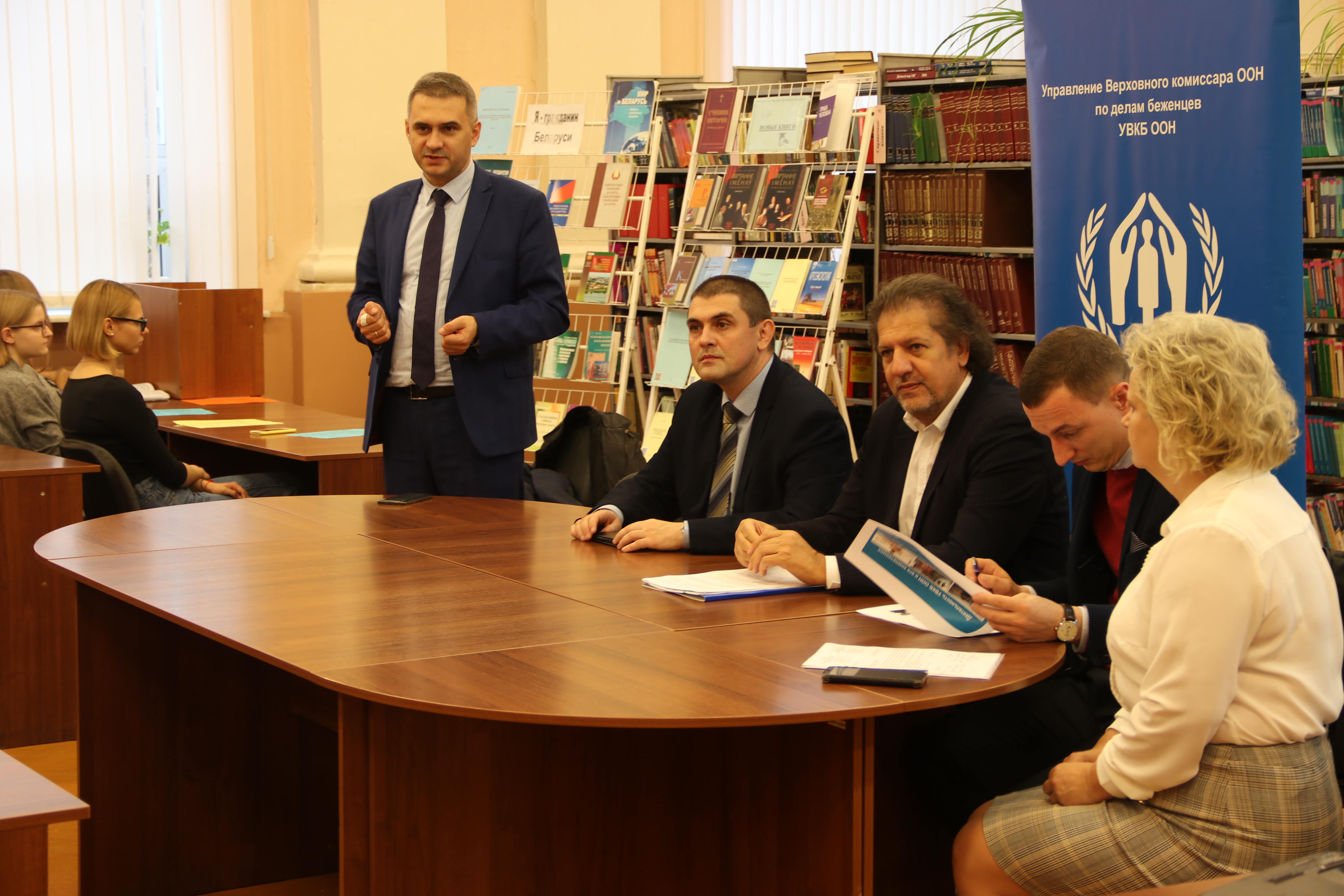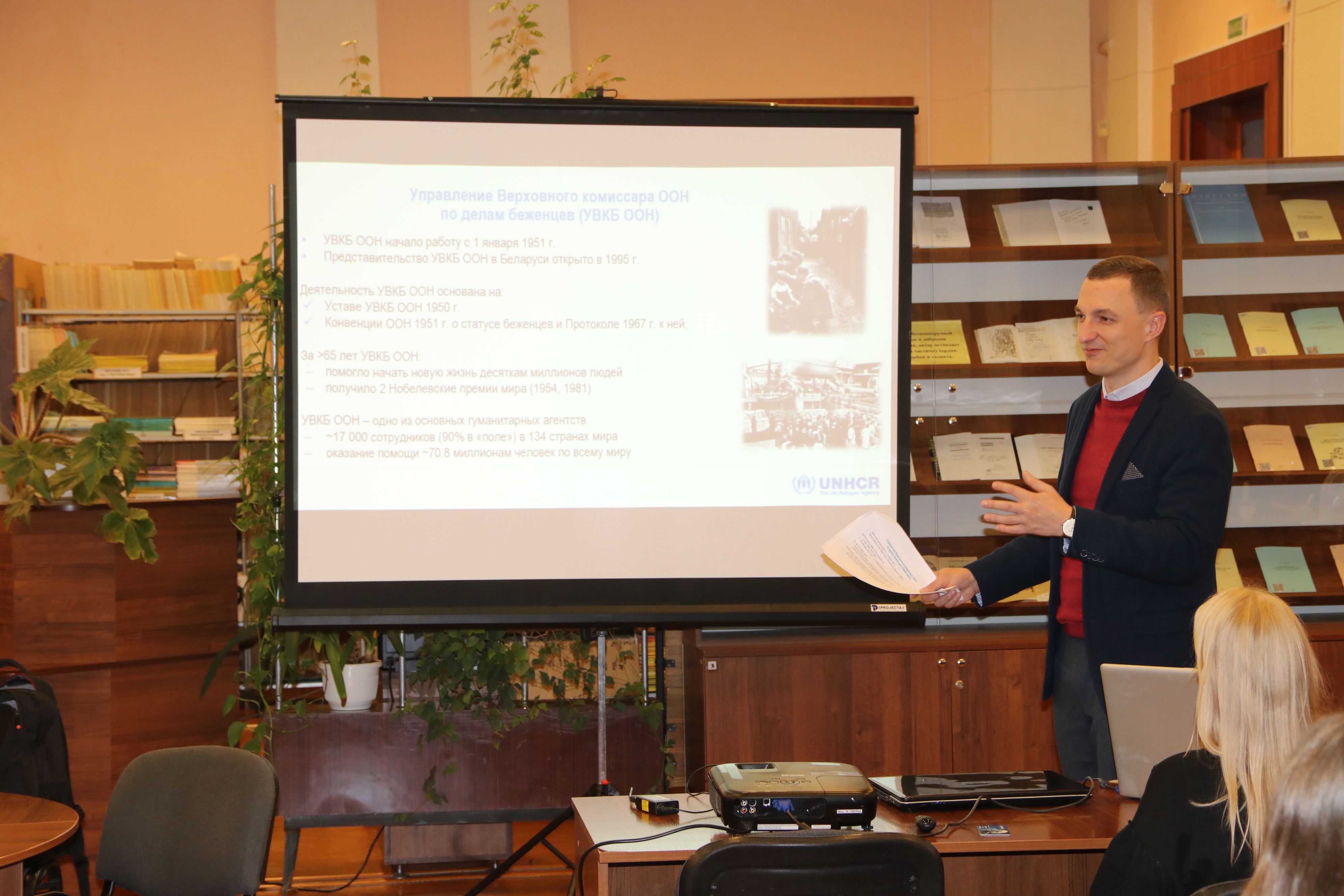 Legal adviser of the UNHCR Office in the Republic of Belarus Timofey Solodkov told students about the UNHCR mandate and the priorities of organization in Belarus and in the world.