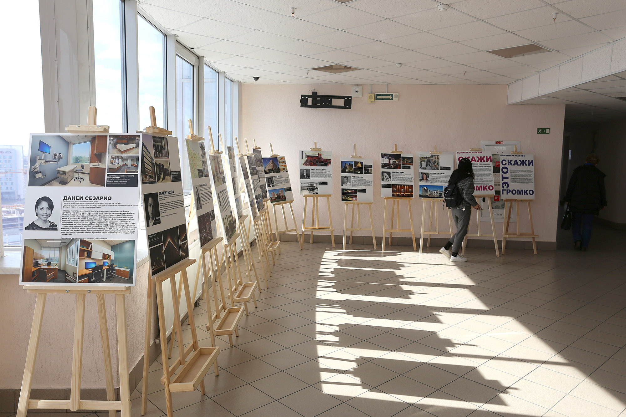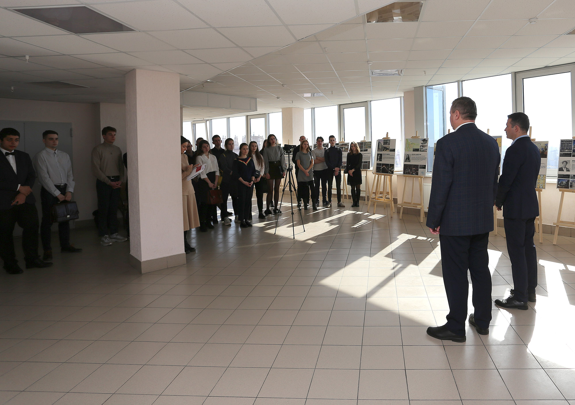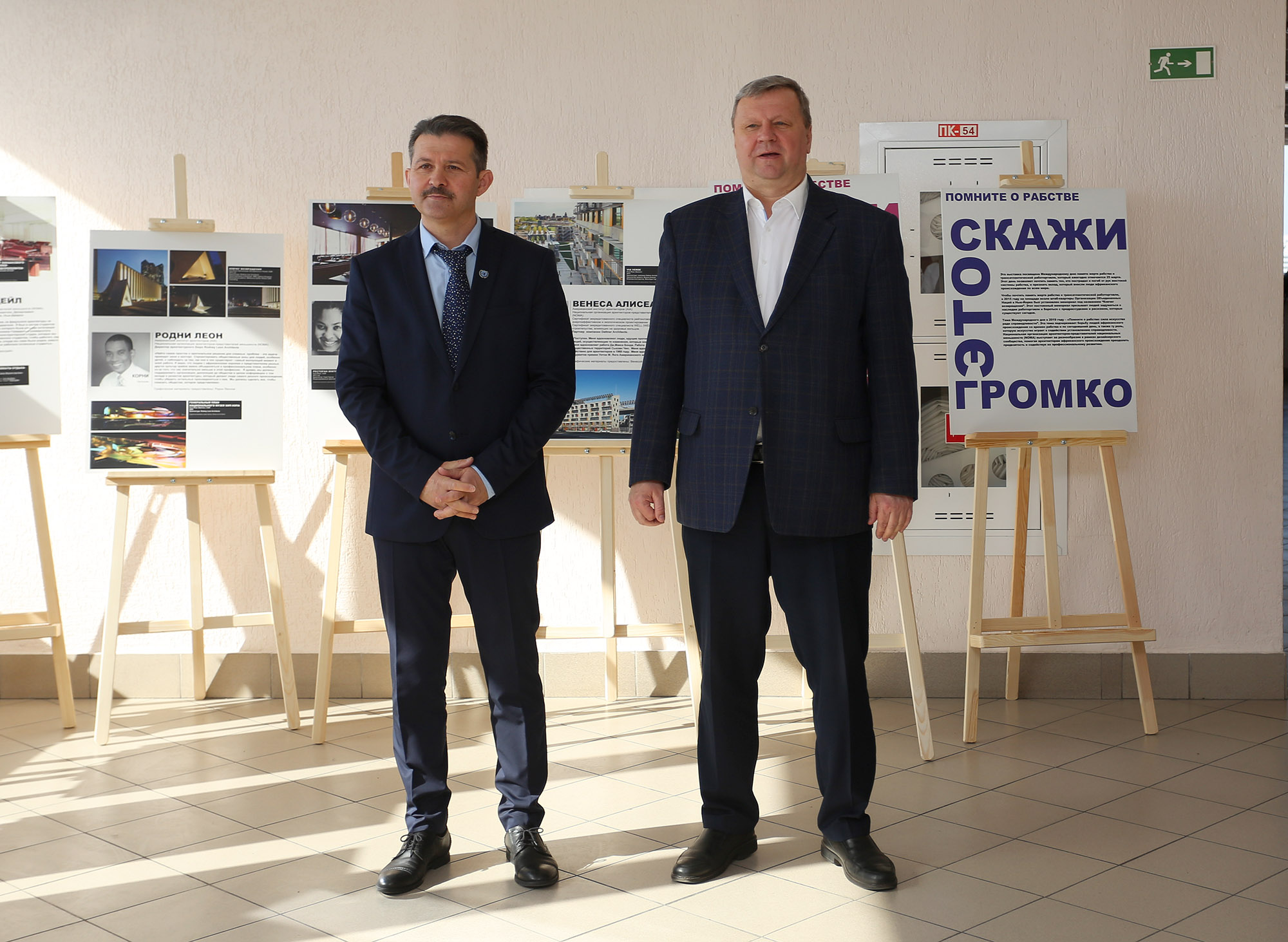 На 12 этаже факультета международных отношений БГУ состоялось открытие выставки тематических плакатов «Помните о рабстве: заявите о нем вслух» с участием декана факультета международных отношений БГУ Виктора Шадурского и представителя Департамента глобальных коммуникаций ООН в Беларуси Виктора Радивиновского.